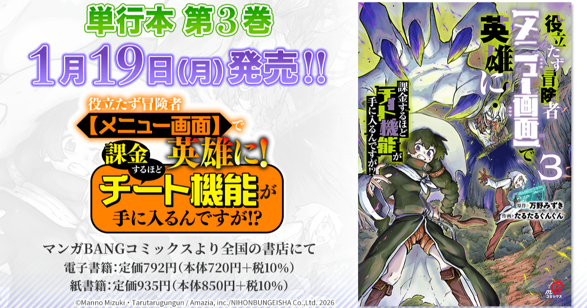 【1月19日発売!】『役立たず冒険者【メニュー画面】で英雄に! 課金するほどチート機能が手に入るんですが!?』単行本第3巻のお知らせ!